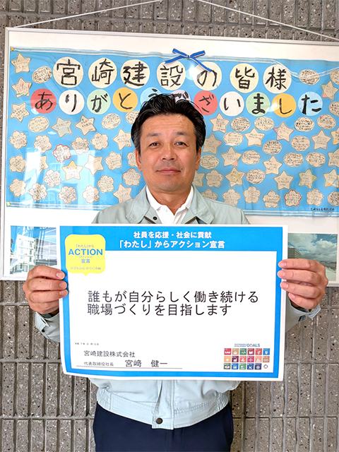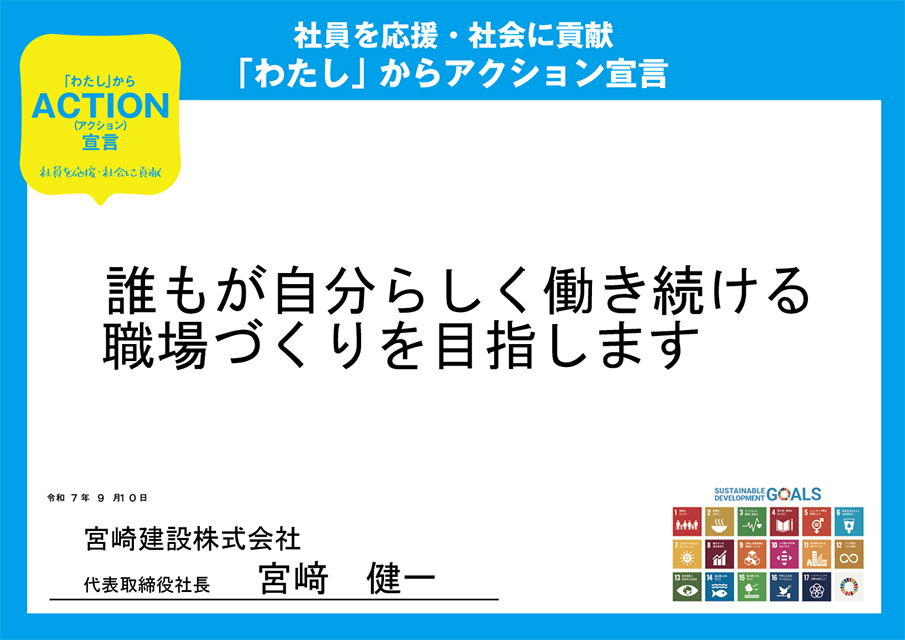 宮崎建設は、建築物を創っていくという事を通じて「世の役に立つ」事を第一の目的とし、その目的に向かって進む社員一人一人が与えられた役割を果たすことによって「物心両面の幸福」を手に入れることを、第二の目的とします。